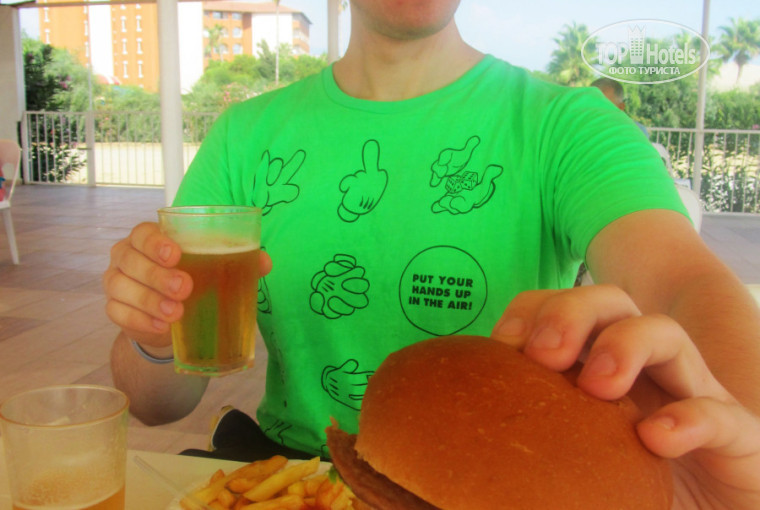 На пляже свой отдельный бар,где так же можно заказать пиво и перекусить в течении дня всяким фаст-фудом,который лично мы очень любим,это гамбургеры,фри,хот-доги,в печке готовят что-то вроде пиццы,но гораздо вкуснее,каждый день с разнообразными начинками.