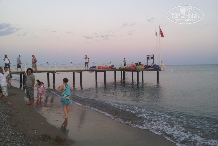 Пляж отеля не большой, шезлонги пластиковые, матрацы чистые, везде урночки и стойки для использованных стаканов, туалеты, 2 душевых комплекса, пирс хороший, правда спуск с него в воду только 1. Море чистое, но из за песчаного дна не всегда бывает прозрачным. Возле пляжа опять таки 2 бара расторана, т.е, кормят поят еще и там. Полотенца выдают не целый день а по часам. Но это не в (-) а так просто особенность. С полотенцами у меня проблем не было, менял каждый день. Рекомендую следующую схему. К 7-00, идете на пляж и занимаете шезлонги, потом в ресторан завтракаете, потом 40 минутный перерыв либо в лобби баре либо на пляже, а потом загорайте, плавайте. Короче, кто рано встает, тому шезлог в козырном месте перепадет. В противном случае перепадет, но не в козырном. Свободныее шезлоги были. Есть еще горки, работающие в определенные часы.