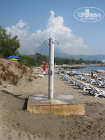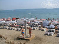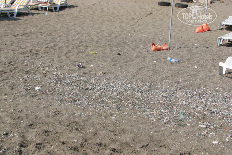 Пляж – убожество!!! Зонтики кривые, ржавые, половина из них поломаны. Лежаки очень тесно стоят. По ночам на этом пляже бухают турки и оставляют после себя мусор(бутылки, окурки и т.д.) На пляж каждый час едет автобус, причем как на пляж так и с пляжа постоянно большая очередь. Когда приезжаешь на пляж, народ бежит сломя голову, чтоб занять место на лежаках первой линии от моря (очень смешно со стороны). Ехать от отеля минут 10. На пляже стоит МЕГАБАР в виде маленькой будки, в которой бедняга турок с 10 до 17-00 наливает безалкогольные напитки(фанта, кола, спрайт) беспрерывно, так как наш народ любит халяву и побольше. Пива нет.