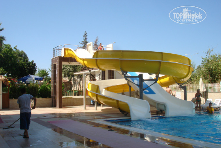 Территория отеля небольшая.Есть два бассейна, две горки. Лежаков на всех не хватало.