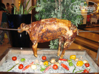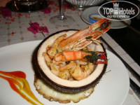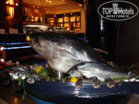 Всего шесть ресторанов: мексиканский, турецкий, итальянский, дальневосточный, стейк-бар и рыбный. Рыбный находится на пляже, на втором этаже пляжного бара. Очень красивый дальневосточный, там суши, морепродукты и все стилизовано на японский манер. Зашли в итальянский, он находится в бизнес-крыле. В итоге выбрали стейк-бар. Резервировать нужно либо через администраторов, либо через терминал самообслуживания. 10 евро с человека. Туманный ресторан (стейк) внутри очень красивый, открытая кухня, где видно кто, что и как готовит. Нам принесли пять деревянных подносов, на которых лежало около десяти видов различных сырых стейков на выбор. Винная карта тоже разнообразная от 15 до 300 евро за бутылку. Выбранные стейки приготовили замечательно. Перед ними принесли салаты. Особого внимания заслуживает салат из креветок. Блюдо, на нем салфетка из ананаса, на ней половинка кокоса, а в кокосе креветки. Очень необычно и красиво, а главное – вкусно. Официанты почти не отходят от вас, при этом все очень ненавязчиво. Подливается вино в бокалы, меняется сервировка и обновляются напитки. У моей Любимой был День Рождения, и от ресторана преподнесли небольшой роскошный тортик со свечками и бенгальскими огнями, бутылку французского шампанского и корзинку нарезанных фруктов. Вечер прошел более чем приятно и красиво. Обязательно посетите хоть один ресторан ля-карт. Стоимость бронирования и прочего запишут на ваш номер. Оплата при выезде на ресепшене в любой валюте.