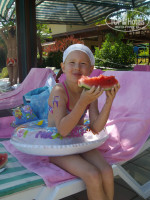 Сервис в ресторане — СУПЕР!!!) утром кофе, чай нальют если лениво самому дойти до автомата. На завтрак в самом здании ресторана делали сок свежевыжатый. В обед и в ужин вино, вода, пиво и т.д. Один день были морепродукты. Ели все, не травились. Каждый день мороженое и в мини клубе и рядом с бассейном. Рядом с пляжем можно поесть гамбургеры, хот доги, фри, были турецкие лепешки, но нам они не особо понравились, ну это на вкус и цвет) Арбузы, напитки каждый день приносили к бассейну часов в 11.00))