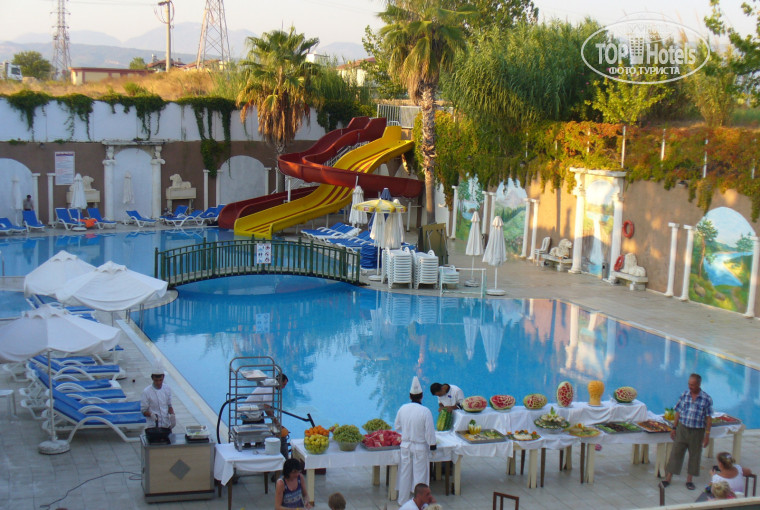 Приехали в отель около 15.00. Нариман номер дал в течение 5-10 минут совершенно бесплатно. Помогли занести чемодан. С номером нам очень повезло - второй этаж, с двумя балконами, один из которых выходил на бассейн и площадку для вечерних представлений. На балконе предусмотрительно стояло 2 пластиковых кресла и табурет. Поэтому мы все вечерние программы (если были в это время в отеле) смотрели с него. В номере все работало. В нем проводили очень мало времени - в основном на море. В бассейне купались один раз - для разнообразия - и он был чистым. В общем то он пользовался большим спросом, лежаки всегда были заняты. Горки работали несколько часов в день,но наш ребенок не катался. Пляжных полотенец, которые выдавали в бане под залог в 10 $ не хватало. На пляж 2 дня ходили со своими.