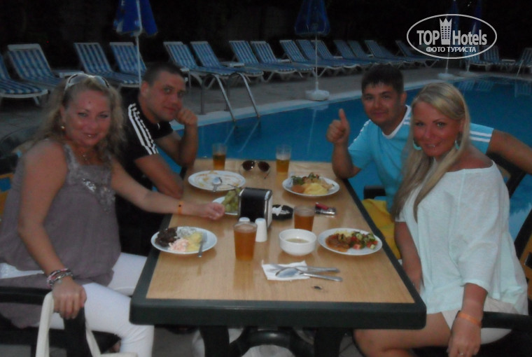 Всем доброго времени суток!!! Смотрю, наш заезд в Августе (01.08-21.08.12) остался всем доволен))) Ребята,кто меня узнал,всем огромный приветттт!!!!!)))) Мы отдыхали с подругой и остались всем довольны. Экономичный и молодежный отель,я не рекомендую его с маленькими детками и "куркулям" пенсионного возраста,которые всем недовольны...Отель расположен в черте города,совсем рядом от Башни с часами, где много магазинов,кафе,дискотек. Территория отеля компактная,но очень уютная.Мы жили в номере 211,на 2этаже.Номер хороший,все работало -кондей, TV,сантехника,фен. Единственное,нам обещали мини-холодильник,так его и не дали,в др.номерах он попадался. Питание-нормальное,соответствует 3*. Завтраки-как обычно во всех турецких отелях, обед-супчик,разные салатики,гарниры, соевое мясо.Ужин-на мангале повар устраивал файер шоу на своей огромной сковороде))),чередовалось либо мясо либо рыба. В полдник пекли турецкие лепешки или были гамбургеры.Фрукты и сладости были всегда. Из алкоголя было пиво,вино(красное,белое) водка,джин..Напитки-кола,фанта,спрайт,содовая,концентрированные напитки.На каждом этаже стоит кулер с водой. Убирались в номере каждый день. На пляж возил автобус,водитель которого Зайчик-красавчик, юморной приколист!( попа!сторожьно-морожьное))))))) Пляж очччень классный,большой пирс,море прозрачное-прозрачное с галечкой...ммммм.....Обслуживающий персонал очень хороший,добрый внимательный. Ребята,молоденькие официанты,очень стараются. Всегда улыбаются, интересуются как дела. На ресепшене ребятам тоже огромный привет,молодцы. Лилечка (гид Пегаса), тебе тоже большое спасибо за хорошую работу! Отдых очень понравился,все прошло на позитиве!