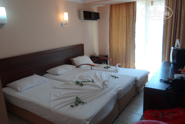 РАЗМЕЩЕНИЕ. Приехали рано утром, около 7 часов, естественно не заселили, сказали прийти позже. Мы оставили вещи на рецепции и пошли завтракать. После завтрака взяли купальнички, полотенца и прямиком на пляж, где и пробыли до самого обеда. Затем, пообедав в ресторане на пляже, пошли заселяться. Девушек на рецепции не было, общалась с мол. человеком на англ. яз. (Фатих, что ли). К сожалению, временного номера нам не удалось избежать, на сутки пришлось заехать в Фэмили рум, Фатих пообещал, что завтра будет хороший номер, а в данный момент только плохие есть в наличии. Спорить не хотелось, хотелось в душ и мы согласились. Фэмили рум нам не понравился, 2 этажа, на первом кровати стоят прямо под лестницей, на втором тёк кондиционер, так что там постоянно образовывалась лужа. На след. день нам предложили на выбор несколько номеров в разных блоках, я остановила свой выбор на 24 блоке, т.к. он находится примерно посередине территории. Близость бассейна с анимацией нас не смущала, с 14.30 до 16.00 всегда спали в номере, при закрытой балконной двери шум не мешал ни мне, ни дочке. Зато до всего близко. Номер, конечно, маленький, мебель старенькая, но всё работало исправно, в т.ч. и кондиционер. Один раз размагничивался сейф, когда отключалось электричество. Впервые, кстати, с таким сталкиваюсь. Но, слава богу, ничего не пропало.