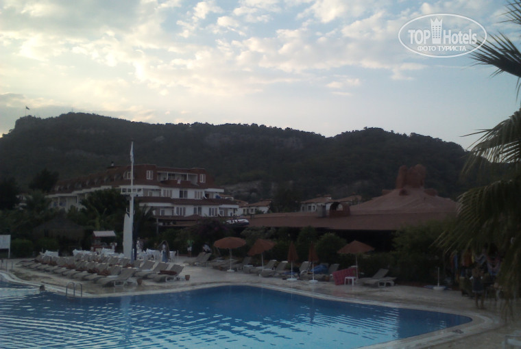 Доброго всем времени суток! Постараюсь написать подробный отзыв, может быть кому-то пригодиться, так как сама выбирала отель, читая их. Итак, тур покупали о Пегаса, в отель приехали в 21:00, на ресепшене очень вежливые ребята- администраторы (по-русски хорошо говорят) встретили, предложили сначала сходить на ужин, а потом заселяться, т.к. ужин до 22:00. Нас приехало шесть человек : я с мужем и двумя детьми ( 15 и 10 лет) и мои мама с папой. Мы попросили поселить нас в одном корпусе, что и было сделано : родителей на втором этаже с видом на главную аллею, а нас на первом с видом на горы. На ресепшене выдали бесплатные пляжные полотенца, багаж отвезли по номерам.. Сейф платный, доллар в день, но оплачивать при выезде. Так что за размещение пять. Номер обычный, с одной двуспальной и двухъярусной кроватями. Минусом номера оказался кондиционер, который висел сбоку от нашей кровати, отрегулировть его было невозможно, дул нещадно, и такое ощущение, что его не чистили никогда. И еще когда балкон открывали, он сам отключался, и это ничего, но потом включался громко. За сервис четверка, т.к. наша горничная нормально убирала номер только если доллар оставишь, а если нет, то полотенце забудет поменять, то воду забудет оставить.Ну ладно, воду и полотенца пару раз сами с ее тележки взяли. Территория отеля очень красивая , вся в зелени и цветах, ухоженная, хотя и не больно большая, зато все зоны распределены очень разумно. Много кошек, все в ошейниках, их там кормят, а между третьим и четвертым корпусом живет ежик, вечером видели несколько раз. Питание на пятерку, разнообразное : и рыба, и баранина, и телятина, раза два морепродукты были, ну курица само собой. Из фруктов персики, сливы, яблоки, виноград. Десерты очень вкусные, а вечером в 19:оо каждый день давали мороженое.Перед отъездом ходили в ресторан а ля-карт, он у них два раза в неделю работает на террасе(10 турецких лир с человека за обслуживание), итальянская кухня , тоже очень вкусно и красиво. Анимация мне очень понравилась, скучать не давали, с утра фитнесс, аквааэробика, после обеда степ-аэробика, танцы живота, вечером развлекательные шоу, турецкая ночь неплохая была. Ездили на две экскурсии : прогулка на яхте в три бухты ( в одной видели огромных черепах прямо в море, восторгу детей предела не было) и на танцевальное шоу "Огни Анатолии", впечатляющее шоу. Обе экскурсии покупали на улице, получилось значительно дешевле при том же уровне сервиса (автобус с кондиционером, гид, питание), как если бы покупали у Пегаса.Подведу итог: отель в целом очень понравился, он семейный, много детишек было, понравился и нам, взорслым, и детям, и старшему поколению нашей семьи, моим маме и папе. Мы прекрасно отдохнули, сейчас вспоминаем, просматриваем фото, скучаем.
