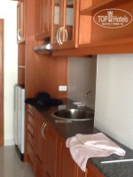 Есть мини кухня, вытежка, раковина, кухонная стеночка - только не понятно зачем...дверцы там не открываются и вытежка не работает, чайника нет. Есть холодильник маленький: туда ставят 2 бутылки воды по 0,5 ежедневно (бесплатно).