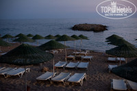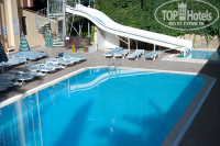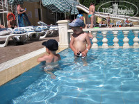 Территорию отеля покажу на фотографиях. Нам она понравилась. Каждое утро там моют все полы и тротуары огромным количеством воды с моющими средствами. И в поселке тоже! Мне понравилось, что территория отеля не огромна. Например, мой сын мог бегать по лобби, пока я сидела в интернете, и я могла почти не выпускать его из поля зрения. Бассейн, как пишут, небольшой. Но именно это и стало преимуществом для меня: я могла сидеть возле сына в "лягушатнике" и присматривать за дочерью, которая плескалась в большом бассейне или каталась с водной горки. Не боясь, что не смогу вовремя ее позвать или броситься на помощь, как это было бы в огромном бассейне. Перед обедом аниматоры устраивали в бассейне "аквааэробику" - веселое занятие, которое явно нравилось принимавшим в нем участие девушкам разных возрастов. После обеда бассейн находился в тени от корпуса, так что мы уходили на пляж. Пляж отеля песчаный, но действительно имеет каменистый берег. Зато его преимущество: рядом с ним как раз общественный пляж с чистым песчаным дном и более прозрачной водой. Большинство гостей отеля купались там. Кто-то играл в волейбол на границе пляжей нашего и соседнего отелей. Мне было интересно понаблюдать за местными жителями на общественном пляже, в том числе мусульманскими женщинами в купальных костюмах, закрывающих все тело. Турецкий общественный пляж ни в какое сравнение не идет с любым крымским, к примеру, общественным пляжем. Все ведут себя очень воспитанно, прилично. Кроме бассейна и лобби на территории есть снэк-бар (там подают перекусы между основными приемами пищи) и бар, детская площадка, и столик для настольного тенниса, ещё "кальянная зона" - под навесом, в тени, с коврами, подушками и низкими столиками. В этой зоне мы спокойно дожидались своего трансфера в аэропорт в день отъезда после выселения из номера (в полдень по международному стандарту) и обеда. Есть даже небольшой тренажерный зал и велнесс центр. Его услуги дороже, чем услуги турецких бань в поселке, но я ими воспользовалась, так как у меня была возможность посетить его ненадолго и только во время сна младшего ребенка. Мне очень помог массаж спины, и понравился хаммам с пилингом и пенным массажем в самом начале отдыха, перед загаром. Про детскую или взрослую анимацию ничего сказать не могу, мы ею не пользовались.