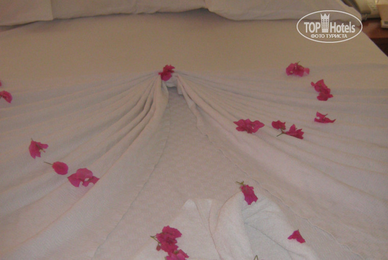 Отдыхали парой с 26.08 по 4.09 2012 г.Когда приехали в отель нас очень гостеприимно приняли и сразу отправили на завтрак. После завтрака не дожидаясь 14.00 (на тот момент было 10.00) нас сразу же заселили в номер, в старый корпус. Номер небольшой(одна односпальная кровать, одна двуспальная кровать, 2 тумбочки, столик с зеркалом и пуфом,шкаф, телевизор, кондиционер),но все чистенько, все исправно работает:телевизор, кондиционер, вода. Каждый день убирались в номере и выкладывали все цветочками! Персонал всегда улыбчивый, особенно бармен и управляющий!