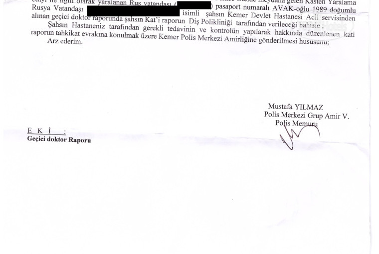 Тот человек (русский), который начал драку на баре с турками официантами, уехал на следующий день. В полиции нам рассказали из-за чего началась драка и кто виноват. и Добавили : вы оказались не в то время, не в том месте.