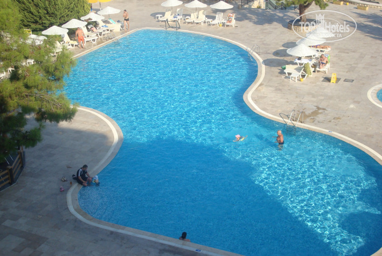 Хороший отель для спокойного отдыха. Преобладают русские пенсионеры. Молодым парочкам будет скучновато, анимация слабовата. Заселили нас быстро, первым делом повели на цокольный этаж ( ощущение сырости, запах....) мы возмутились, нам предложили доплатить 200 $ за номер люкс. предложенные нами 20$ не устроили. После громких возмущений мы оказались на 4 этаже с замечательным видом на море ( нам это ничего не стоило). Питание на 4 , много всевозможных овощей, из мяса курица, из рыбы только скумбрия жареная, из фруктов (арбуз, дыня, виноград, слива) Много десертов НО вкус специфический. С пустыми тарелками никто не уходил, но нашему маленькому сыну нечего было есть. Море чистейшее, лежаки на море надо занимать до завтрака у бассейна всегда есть свободные. В детском бассейне сына не купали, там не вода, а сильнейший раствор хлорки. Номера маловаты, убирали каждый день, полотенца и постельное меняли тоже каждый день. Впечатление положительное, но второй раз не поехала бы.........