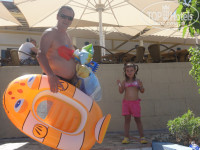 Аниматоры в течении дня вытаскивают народ с лежаков то на гимнастику,волейбол,теннис водное поло, дартс, особо не надоедают, все по расписанию. Бассейн очень большой с морской водой,по сравнению с морем холодный. Детского лягушатника для детей до 3-4 лет рядом нет, как и в Олимпии, поэтому, берите детям какие-нибудь спасательные принадлежности. На соединении 2-х бассейнов есть мелкота под мостиком,но это не безопасное место для малышей,Маша плавать не умеет,ее спасали плавнечки на руках,но и Папа с Мамой пару раз спасли,когда она без них плюхнулась возле мостика где шла гимнастика,однако до дна не достала,на помощь никто не бросился, БУДТЕ ВНИМАТЕЛЬНЕЙ. Зато есть детский мини клуб,которым мы пару раз воспользовались,оставив там Машу на 2-3 часа.Ей там кстати нравилось. Некоторые оставляли своих детей на весь день,с 10 до 18 часов.С ними там занимаются девушки по плану,одна из них из Прибалтики, хорошо говорит по-русски, денег за это не берут. После детской диско примерно в 21-30 начинается выступления для взрослых и части детей, которые остались бодорствовать, продолжается это до 22-45,потом кто-то идет пьянствовать на этаж выше, кто-то спать. Недалеко от вечернего бара, ближе к ресепшону, всегда можно добрать пищи в желудок в виде пирожин и булок с ветчиной и сыром.Ну а если у Вас остались еще силы, топайте на дискотеку на самом нижнем этаже с 24 до 2-00,только алкоголь там платно, но брать его никто не заставляет.