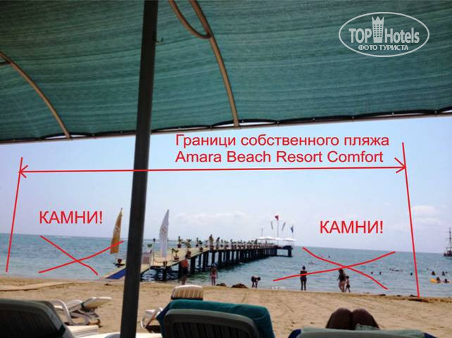 2. О том, что на собственном пляже отеля Amara Beach Resort Comfort невозможно купаться из за камней на пляже, которые находятся повсюду в зоне купания на Вашем пляже, об которые можно пораниться или получить физические повреждения. Ваши клиенты приезжают отдыхать, а не получать увечья и переломы оплатив дорогое проживание в Вашем отеле! И что бы так не случилось все Ваши клиенты вынуждены купаться на территории пляжа соседнего отеля, который и без этого переполнен или с Вашего пирса, опоры которого обросли ракушками, которые не убирают с опор, в следствии чего отдыхающие получают травмы и порезы.
