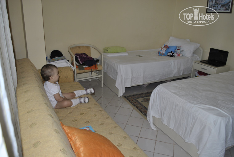 При заселении вручили "рашен презент" в виде блока сигарет. Номер был на 3 этаже в корпусе D, достаточно просторный. Ни запаха сырости ни плесени не было, белье сохло моментально. Да с маленьким ребенком на руках было тяжеловато, но это компенсировало отсутствие тренажерного зала). Вид был на соседний корпус + частично на море. Огромный балкон. Мебель не новая, но вполне приличная: шкаф, 2 кровати, раскладной диван, трюмо, тумбочка, столик + 2 стула и пуфик - на балконе столик и 2 стула. В номере все работало без нареканий. Комары нас не беспокоили - брали с собой фумигатор, на ночь закрывали балкон и ванную комнату.