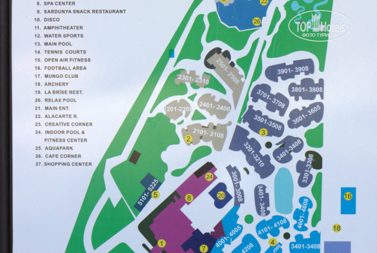 Заселяют с 14.00. До этого времени можно переодеться в туалете и оставив сумки на рецепшене гулять по отелю и пользоваться его услугами (благо браслетов нет). Если заранее не бронировали то можете попасть как в бунгало (большинство номеров там) или в основной корпус. По большому счету разницы нет ибо номеров как в перовом так и во втором случае глядящих на море мало (или закрывают сосны или другие бунгало или не смотрят на море), а идти к морю или ресторану не так далеко. Самые удобные по моему скромному мнению те что на карте выделены голубым цветом.