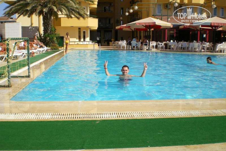 Отель,на самом деле,не очень.За"нормальный номер"(на шестом этаже,с видом на море и балконом)пришлось отдать 50 баксов,но можно было и поторговаться.Кормят зеленью,сплошной соей и курицей,иногда дают рыбу.Есть ещё картошка,рис и макароны.Суп похож на баланду.Сладкого много,но на любителя.Бесплатное пойло пить не возможно(в магазине при отеле пиво-2,5 бакса).Бассейн,естественно,воняет хлоркой,но чистый(после 19 часов купаться запрещено).Пляж перед отелем-не пляж.Лучше ходить направо,где больше всего людей.Анимация...мы вообще не поняли какая цель у этих парней из Грузии,короче-фигня.В общем,если Вы приехали туда отдыхать,купаться и загорать,а не жрать и бухать,то там нормально.Если хотите посмотреть достопримечательности-берите больше денег(где их потратить мест навалом).Говорят,хороший отель"SAPHIR"-лучше туда,точно не прогадаете.Приятного вам отдыха.