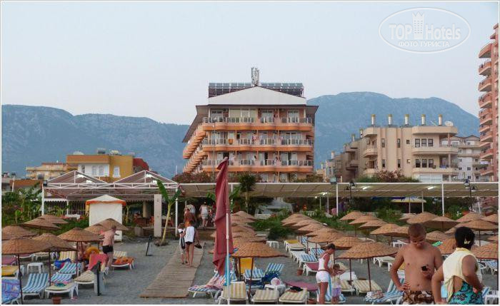 Всем привет! Мы с мужем ездили в прошлом году (2011) в этот отель, в Турции были впервые, нам все очень понравилось! Минусы: 1) от аэропорта ехали на автобусе 3 часа, позддка утомила; 2) вселили в корпус через дорогу, мы изначально выбрали первый корпус, но нам предложили ч-з два дня переселиться в первый корпус; 3) вода в душе была мягко говоря прохладной, но при жаре 50 гр. нам особых неудобств это не доставляло. Плюсы: 1) Природа просто поразила! Мы были в июле - все цвело, цветы и кустарники и деревья необычайной красоты! Дороги, тротуары ухожены, нигде нет мусора, люды доброжелательны; 2) Несмотря на проблему при вселении - комната была вполне приличная, на 4 вполне тянет, телевизор с русским тв, фен, кондиционер, сейф (за отдельную плату); 3) В районе отеля 2 бассейна - вода чистая, теплая, горки для взрослых и детей, сауна, тенис, бары внутри отеля и около отеля и прочие развлечения. Анимация по вечерам для взролых и детей. Для детей правдя каждый вечер было одно и тоже (к концу отдыха надоело даже), но дети были в восторге; 4) Питиние на убой! Все вкусно, разнообразные овощи, фрукты, арбузы дыни, мясо почти небыло но мы были очень довольны тем что готовили. А какие на десерт сладости! Просто объяденье! Салаты с майонезом и прочие мы не брали (говорят их готовят из того что не доели на завтрак) но свежие помидоры, капуста и прочее - были вполне на 5. На пляже тоже готовили хорошо. Картошка фри, гамбургеры, свежие овощи. Короче говоря еда нам очень понравилась. 5) Море теплое, пляж очень мелкая галька. Я плохо плаваю - для меня была проблема - очень сильный прибой, волны иной раз с головой накрывали, а мужу понравилось. Вода правда соленая очень, глаза щиплет. Пляж чистый, мусора нет, всегда есть свободные шезлонги. Площадь большая, теснится вообщем не приходилось. 6) Экскурсии разнообразние на все вкусы, мы были в горах на джипах - впечатления на всю жизнь!
