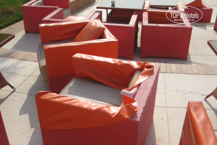 Теперь о минусах. Очень не понравилась другая часть отеля (не спальная). Я как увидела эти убогие красные плетеные кресла, которые уже давно надо выкинуть, мне стало неприятно. Плетенка почти везде лопнула, свисают лохматы какие-то, все выгорело, дерматином сделаны заплатки…..Даже в трешках я такой рухляди не видела. Я считаю, что это неуважение владельца отеля к своим гостям.