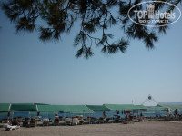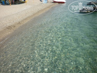 4. Пляж и море. Море чудесное - чистое и очень теплое, мусора за неделю не было ни разу. Вход мелкая и средняя галька, немного колючая, но я входила и босиком, есть пирс с удобными пологими лесенками, на пирсе душ (мелочь, а удобно). Места на пляже ходила занимать в 7 утра, к этому моменту где-то половина уже была занята, во сколько-остается только догадываться ))) Правда места подальше от моря можно было найти всегда. Пляж большой, хороший, но мне кажется можно еще добавить тентов, чтобы раздвинуть лежаки. На пляже есть кулер с водой.