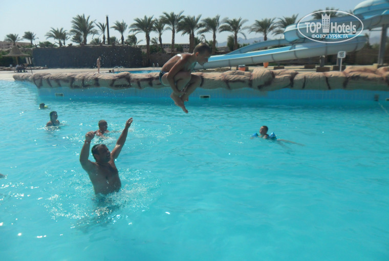 Теперь все по порядку. Расселение на 4. Прилетели в 9 утра от Анекс тура. Встретили отлично. Ездили 7 человек. Мы с мужем, сын 8 лет, мои родители и их друзья. Компашка большая и шумная. Мы с мужем уже не в первый раз в Шарме, а "старички" впервые. За 20$ на всех (три номера) расселили буквально за пол часа, а так сидите и ждите 2 часов как надо. Браслеты пощепили сразу же и наши мужички пошли изучать территорию отеля не дождавшись номеров, бо в горле пересохло и из бара на верху тут же притащили нам попить. Номера большие и светлые. Все работало. Есть маленькие нюансы, но где их не бывает?? То вода в раковине сходит медленно, то кондер не сразу дул хорошо, но при первом же обращении к уборщику все исправлялось в мгновения ока и не надо было ходить на ресепшен.Все улыбаются и не ХАМЯТ как было написано в предыдущих отзывах. Вести себя надо прилично и получите такое же отношение к себе. Долго объясняли что беларусы не Россия. Питание - это просто издевательство над людьми!!!! Как можно всю эту ВКУСНЯТИНУ СЪЕСТЬ!!! Попробовать даже не получалось то что видешь. Завтраки немного однообразны, но где вы дома видели на завтрак 20-30 блюд???? На обед изголялись как могли, и вегитарианские блюда и курица и рыба и говядина и даже какую то ламу готовили. Часть блюд готовят прямо у тебя на глазах и все улыбаются и желают приятного аппетита. Официанты постоянно заигрывают с детьми. Малышей вообще обожают, пока родители ходят за едой с удавольствием приглядят за шалопаем, и глазки сделают и песенку спают!!! До моря 7-10 минут ходьбы или 3 минуты на автобусике. На пляже есть бар где и перекусить можно и выпить. Да из спиртного пить можно только пиво, вино (если не разбавят),джин или водку (как не странно из всех крепких напитков единственное было приличное) а вообще мы с дютика брали свое. До обеда всегда на море были волны и красных флаг а вот после обеда вода супер (в песчаной луже до 35 градусов наверное доходило). Детки и старички на мелководье плавали а мы ходили с маской на пантон. Про аквапарк отдельный разговор. Сын плакал когда уезжали!!! Горки работают с 10 и до заката. По времени. бассейн с искуственной волной каждый час 15 минут. Возле каждой горки по два смотрящих. Молодцы. Работу выполняли четко. Белые горки просто супер, но стремные. Высота 4-5 этажей. Мы отдыхали возле синих горок и бассейна с искуственной волной. Всего и не напишешь. Отдохнули очень хорошо, приеду еще раз!!! Сходите на рыбный ужин это что-то!!!!!!!!