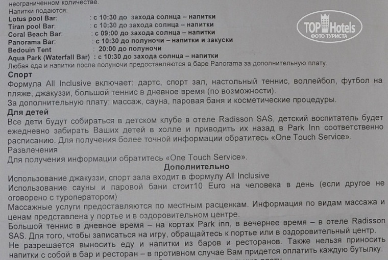 Аквапарк. Бесплатный, находится на территории отеля и открыт для посещения для гостей отелей Парк Инн и Рэдисон Блю, но почему то с Рэдисона никто не ходит. На территории аквапарка выдают полотенца, есть два бара, в одном из которых в течении дня можно перекусить. Множество горок на любой возраст, бассейн с волной, которую включают несколько раз в день. Большие горки, где работает обслуживающий персонал, то же работают с перерывами. Все остальное работает с утра и до захода солнца.