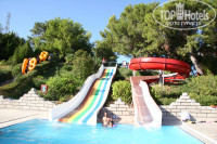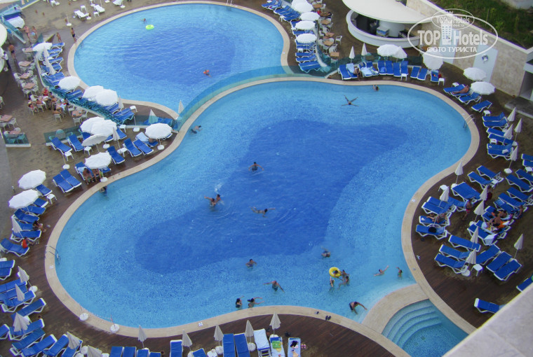 5. Территория. Разделена на 2 части – аквапарк и отель. Деление – условное, просто на территорию отеля не пускают посетителей аквапарка. Фото территории отеля прилагаю – смотрите сами. В центре – каскад из 3 бассейнов (не соединены между собой), один бассейн – над рестораном (там загорать хорошо – жарко и ветрено), детский бассейн в миниклубе. Там же – детская площадка (пара горок и пара качелей), только на ней почти никогда никого нет – все или в мини-клубе, или в детской зоне аквапарка. Амфитеатр слева, там же – теннисный корт. Зарядка – в амфитеатре. Настольный теннис – рядом. Ниже – проход к морю. Можно пешком (если попу подкачать хотите ), можно- на лифте. У моря первый уровень – пантон из досок, выше – пантон с песком (мелкий, белый, слабо нагревается), еще выше – бар со столиками. Территория отеля не зеленая – есть, конечно, деревья, но больших газонов и обилия цветов не найдете. Если вам надо это – езжайте в Ganita Garden Club (сейчас называется Atli Bay) в Конаклы – вот уж где зелено! А это- Планета ВОДЫ!