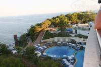 7. Номера. Нам дали 2 номера с видом на море (фото из них сделаны) на последнем этаже и один номер с видом на пустырь, но большой зато (мы с 2 детьми были). Без всяких 10 долларов. Я сначала расстроилась, что не на море наш номер. А потом поняла, что для нас это лучше – не слышно анимации вечерней, можно с открытым окном спать. И салют видно из номера . Фото номера – прикладываю. Хорошие раскладушки для детей. Кондиционер работает независимо от карточки и можно оставить прохлаждать номер, пока ты ужинаешь, например. К тому же сделан над дверью, в итоге прямого потока нет ни на одну кровать. Полы – плитка и ламинат. Матрасы хорошие. Телевизоры небольшие, но ЖК. Ванна со стеклянной полушторкой (не удобно – вода все равно на полу, хорошо, что слив есть). Минибар дополняется только водой (сначала – еще кола, фанта, сода). Тапочки, шапочки для душа, шампуни, мыло, в некоторых номерах – швейный набор (у нас не было, у родителей – был).