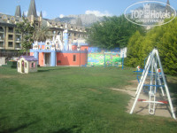 Приехали часов в 12, заселение в отеле в 14 часов, я это знала, мы ничего не требовали, просто оставили чемоданы, пошли перекусили и обследовали территорию. Было жарко, мы достали купальник и плавки, переоделись в туалете и пошли в бассейн с горками. Когда мы на плавались и на нырялись нас заселили в хороший номер на 1 этаже с видом на горы.
