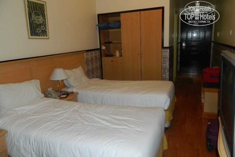 Заселились. Скромный номер, вид был на Нассер сквер. Три раза за наше пребывание в 6 утра были слышны молитвы из мечети.. Достаточно громко, я просыпалась от них.. В коридорах присутствует специфичный запах.. Везде выложена плитка на стенах.. В жару, наверно, хорошо.. По номеру: телевизор ловил 3 русских канала: ТВ3, ОРТ и НТВ; есть холодильник, в мини-баре все платно; гель, шампуни, мыльца ставились ежедневно по мере того, как заканчивались, уборка - каждый день, полотенца, действительно, серые, но чистые. Белье постельное менялось, но только простыни, наволочки не обратила внимания, у меня испачкался пододеяльник в первый же день, то есть была отметка, так он и остался со мной до конца пребывания несмененным. Чаевые оставляли, качество уборки не менялось. Последние 3 дня вода была не особо горячей, но жаловаться не ходили. Что-то у них с водой не все хорошо.. Попросила переходник, мой фен не тянул через их розетки, без проблем дали, денег не взяли за него.. Мы брали завтраки и обеды, ужины в этом отеле не предусмотрены.. На обед, конечно, более шире выбор по еде, в целом кормили не плохо, наесться можно, но многие жаловались, что всегда одно и то же.. я бы не сказала, выбор был, фруктов мало: грейпфрукты, финики и арбузы всегда на завтра, фруктовое ассорти в обед в плюс к завтраку. Яйца, омлет, фасоль, картофель, тосты, овощи, мясо, курица, рыба, макароны, вермишель, супчики, сыр, помидоры, перец, огурцы, соленья, булочки разные, десерты, фрукты – все было.. В Турции, Египте, Тайланде выбор фруктов обширнее, но тут все-таки вкуснее кормят, на мой взгляд.. Имею ввиду, в отеле.. Понятно, что в ресторанах на улице все равно лучше..