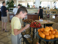 Питание было вкусным и разнообразным. На завтрак всегда было четыре вида соков: клубничный, апельсиновый, томатный и из гуавы. На обед и ужин подавали очень хорошее красное и белое вино, по-моему, называется Фараон.