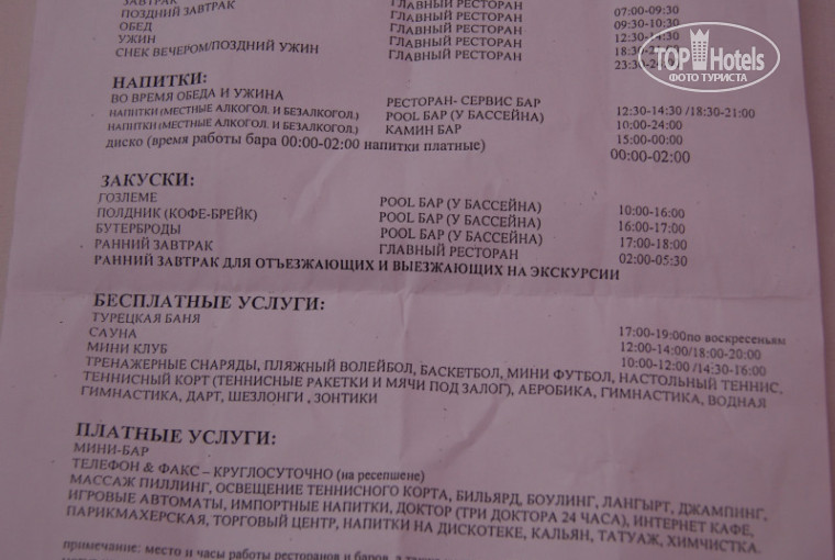 1. Размещение происходи в 14:00 +/- 20 минут. Кто бы во сколько не приехал. уважаемые отдыхающие НЕ НАДО БЫТЬ СТАДОМ!!! НЕ НАДО ТЫКАТЬ БАКСАМИ В НОС ЧЕЛОВЕКУ КОТОРЫЙ С ВАМИ РАБОТАЕТ, это не принято не в одной стране мира! Не надо ОРАТЬ, что я приехал в 06 утра и прочее...все всё равно за полчаса будут сидеть по номерам и распаковываться. Как было у нас мы встали в организованную очередь и в течении 10 минут очередь из 10 человек была отпущена с ресепшена с ключами, а кто орал так и остался там орать и взбухать...(вы может и считаете что турки не люди и все такое. тогда с какого Любезные вы ко мне плохо относитесь я с вами из одной страны и одного самолета, быдло никто не любит!)