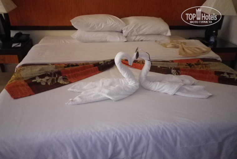 Все в номере новое, огромная плазама телевизора, новая мебель, большая двухспальная кровать, картины на стене, холодильник с бесплатным минибаром: 1,5 л бутылка воды, 0,25 л миринда, севен ап и пепси. Чайник, чай, кофе. В шкафу много вешалок, сейф, в туалете ванна со стеклянной загородкой, раковина, туалет, биде. Единственное, что меня удивило, это то, что не было никаких баночек с шампунями, лосьонами и остальным барахлом, которое бывает во всех отелях. В ваной и рядом с биде висела пластиковая коробочка, как в общественных туалетах, с жидким мылом. И шапочка для душа в единственном экземпляре. Поэтому я очень порадовалась, что взяла с собой свои баночки. Единственное, что было не очень приятным - это холодный мраморный пол - босиком не походишь. И да забыла, невозможно было поймать струю воды нужной температуры, у них какие-то проблемы со смесителем и вода течет то кипяток, то холодная, на третий день мы нашли, как с этим бороться - набирали ванну воды и залезали в нее.
