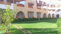 Пляж огромный, лежаков много. Пантон пластиковый, недлинный (метров 20-30). Волейбольная площадка, боча. Риф -не плохой. (Хотя в бухте Шаркс Бей мне кажется живности больше). На лужайке утром - зарядка.