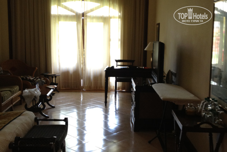 Общее впечателние - отличное: нас очень мило встретили с традиционным индийским поклоном со сложенными руками и надели на каждого бусы из ракушек, в последствии таким жестом(поклоном) нас встречал каждый работник отеля, начиная с ресепшн, заканчивая охранниками на пляже. Отель достаточно красивый, но не шикарный. Номера очень большие и в них очень много лишней, на мой взгляд, мебели (журнальных столиков, банкеток) но нет самого главного - сушки. Влажность высокая, сушить негде, приходилось выставлять одну из банкеток на газон, но такая роскошь только для живущих на первом этаже, остальные незнаю как выходили из положение. Я просила чтобы принесли сушку, но не принесли. Уборка 2 раза в день, в первый день они спрашивают нужна ли вечерняя уборка и если нет, то больше с этим вопросом не пристают. В номере есть все что перечислено на сайте, так же от отеля - комплемент - баночка орехов кешью, баночка банановых чипсов, бутылочка портвейна и по 2 бултылки воды каждый день оставляют те, кто убоирают. Так же есть чай/кофе/сахар/сливки. Минибар за отдельную плату, но там ничего интересного(холодный кофе/сок/пепси). За неделю 2 раза приносили цветочные композиции в корзинах - очень приятно. Обычно везде только срезанные на постель кладут, если повезет. Вобщем очень много приятных мелочей. Молодцы!!!