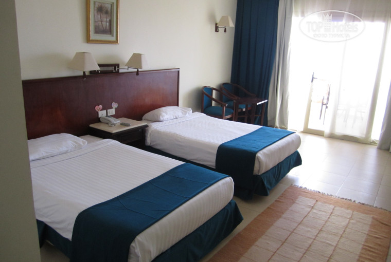 Наконец-то нас поселили в номера категории стандарт, корпус D1 (справа от главного здания) на 3 этаже с видом на море. Носильщики не дали нам возможности самостоятельно забрать наш багаж в номер, и нагло выпрашивали чаевые. Номера нас порадовали – тёплые (солнечная сторона, что очень важно в феврале), просторные, чистые, с балконом, правда с 2-мя кроватями вместо 2-х спальной, но это уже мелочи. В номере по приезду есть 2 бесплатных бутылки воды и чайный уголок. По мере необходимости, воду можно набирать в кулерах на 1 этаже у каждого входа в корпуса. Также в номере есть ТВ (4-5 русскоязычных каналов), бесплатный сейф (обязательно храните все ценные вещи в нем), по комплекту полотенец на каждого, дозаторы с жидким мылом в душе, фен. Если Вам нужен утюг, лучше возьмите с собой из дому, т.к. в номере его нет. Кондиционер в рабочем состоянии, но мы им не пользовались, т.к. не было необходимости. Проблем с горячей водой не было. Ещё один совет: будьте осторожны с тумбочками, мебель старовата и может местами разваливаться. Мы старались не раскладывать вещи по всем полочкам, достаточно было большого шкафа (вешалки есть).
