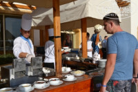 Про питание. Очень хочется взглянуть в глаза тем людям, которые пишут кривые слова про еду..... По моему все супер. Разнообразие имется. Пусть не очень много - но море продукты имеются. Фрукты тоже есть - финики, апельсины, что-то типа дынь маленьких, яблоки, бананы.... Из первых блюд обычно пару супчиков. Однажды даже наблюдал супер блюдо. Надпись на этикетке - суп-борщ (причем слово борщ - английскими буквами). Про выпечку вообще отдельный разговор - всё попробовать так и не удалось, времени не хватило. Алкоголь в барах только местного производства, есть и буржуйский - но за отдельные деньги. Вино местное никакое. Пили местное пиво и коктели - ром-кола, джин-тоник и т.д.