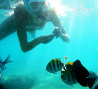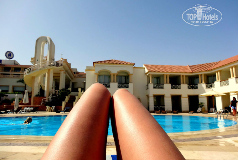 Территория отеля. Вот то что мне действительно понравилось так это расположение! То что через дорогу надо перейти это вообще ерундовина, там 2 шага всего и машин почти не бывает никогда. Бассейны удобные, красиво все оформлено и бар поблизости. Еще пара шагов и уже пляж, песчанный (гальку терпеть не могу). Море чистенькое, кораллы совсем рядом, даже плыть не надо, вот это действительно большой плюс! Рыбы правда наглые, меня даже за ноги кусали, мол гони хлеба. А так очень красиво! Басик кстати с подогревом что очень круто когда после моря замершая идешь и плюх в теплый бассейн. Один раз правда с хлоркой переборщили и ею воняло везде, она даже в стаканам с алкоголем была, бе ((