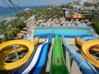 ДЛЯ ДЕТЕЙ. ЕДА. Предлагалась с утра овсяная и рисовая каша, на обед один-два вида супа-пюре (куриный, грибной, овощной, фасолевый..), прокормить можно! мои же ели макароны)))картошку фри)))куру-мясо. В детском кафе с утра ничего не дают(( На обед видела макароны, картошку фри, пюре, мясо, котлеты, сладости, сок в упаковках (НО! сок очень быстро разбирают!). ГОРКИ. Одна совсем для маленьких и средняя у основного корпуса, остальные восемь у моря в аквапарке (кроме «камикадзе»), плюс доделывают мини-аквапарк. АНИМАЦИЯ. С утра до вечера, но с перерывами на еду)) В мини-клубе можно попрыгать на батуте, есть горки и качели, комната игр. Раскрашивали рисунки на футболках (НО! 20 баксов!), а вечером их выдавали на мини-диско с маленьким призом (или 2 доллара, или кепка с рожками, или веер или..) и поднятием героя-художника на троне вверх)), вообщем, одно и то же каждый день. ЛУНАПАРК. Бесплатный!!! Карусель, электромашинки, «чашки» и паровозик, два раза в день по 45 минут.