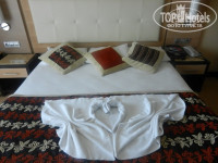 НОМЕР. Сам отель большой, вернее сказать вытянутый, поэтому хоть и много народу, но никого не видно, не слышно. Бронировали фемели, дали номер 5138, это двухуровневый, вид боковой на виллы, море, горы. Номер классный! НО! Очень крутая лестница на второй этаж, маленькому ребенку без присмотра лучше не подниматься, да и взрослому под градусом тоже))) На втором этаже (как и на первом) две кровати (сдвигали – получалась трехспалка), там ложили малого на дневной сон, шкаф-купе, телевизор, стол с зеркалом, тумба, правда холодильника нет. На первом этаже плюс шкаф-купе с бесплатным сейфом, холодильник с бесплатным мини-баром (раз в неделю: фанта + пепси, ежедневно: вода 1,5 литра, детский сок 2х0,2 литра, минеральная вода 2х0,2 литра), балкон (два стула и стол), ванная с туалетом совмещенная (НО! душ без шланга! малых детей очень неудобно мыть, приходилось наливать ванну, также имелись: ватные диски 4 шт., ватные палочки 4 шт., шапочки для душа 3 шт., пилочки для ногтей 2 шт., гель для рук 2 шт., гель для душа 1 шт.). Заходила в стандартный номер – наш первый этаж, правда с добавкой дивана. Только у нечетных номеров вид на море, НО! выход на дорогу! шумновато, а если едете с детьми, то придется жить с закрытой балконной дверью (так практически не слышно шума дороги и дневной музыки). Четные номера – на реку и горы, там своя прелесть – тихо, но присутствует вечернее кваканье лягушек))) Хотя нас не напрягало, а детям даже нравилось их послушать)))