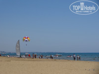 До него идти пешком 7-10 минут. В июне ходил каждые 15 минут открытый автобус .В сентябре "маршрутка" каждые 30 минут .Но чаще ходили пешком ,не далеко .Пляж широкий ,длинный ,чистый песочек. В июне вода была прохладной ,в сентябре как парное молоко ,вечером классно было купаться. При отеле на пляже кафе ,в нём иногда обедали, можно перекусить ) Безалкогольные напитки на пляже бесплатно(всевозможные напитки красители)Кола, спрайт, горячий шоколад....Я любила пить подобие морса .Лежаков не хватило пару раз в первый с мамой загорали у соседнего пляжа за красивые глаза бесплатно и второй раз потому что была большая компания разместились на песочке ).