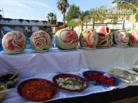 В первый приезд была немного получше. Жарили разное мясо на улице(гриль). В остальном так же как и во второй приезд. Только осенью наверно фруктов больше. На выбор предоставляли рис, картофель фри, картошку,макароны. Курицу в разных вариациях, говядину. Гарниры на выбор. Из фруктов :яблоки, белый виноград, арбуз, апельсины,сливы,тыква. Множество пирожных, булочек. Голодными никогда не оставались, но после 2 недель отдыха мечтала о куске свинины )На счёт мест за столиком их нужно было занимать только по вечерам !!!Днём и утром всегда были свободные места. А вечером все перед шоу хотели сидеть на улице ,поэтому мы приходили когда все поужинают весь ресторан был свободен .Посуда ,вилки, скатерть были всегда чистыми что для меня важно! Иногда просила сменить скатерть не успевали менять.Прочитала здесь про одноразовую посуду из них были только стаканы для спиртных напитков (считаю это вполне нормальным)так как наши русские "многие Тагил" вести себя и пить совершенно не умеют.Про чистые вилки ,ложки всегда можно было спросить у официантов или сходить и взять самим,а не писать здесь посуды у них не было!!!