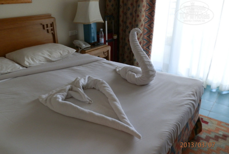Номера достаточно большие и в полном порядке. Обстановка замечательна. В номере есть холодильник (ежедневно снабжался водой), спутниковое телевидение, кондиционер, сейф (бесплатный), фен, чайник с кофе и чаем. У меня бал номер с большим балконом и с видом на море, где стояли два стула, стол и шезлонг. Номер каждый день убирали и приносили чистые полотенца. Также регулярно убирали всю территорию отеля и пляж.