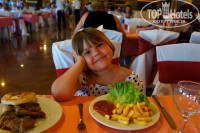 За питание поставила 4 лишь потому что не было каш... поэтому ребенок в основном ел фри и макароны...А вообще с едой там все нормально...и мясо и рыба ..фрукты овощи всего предостаточно...По утрам и яичница и оладушки все как обычно...вот только арбузы с дыней были не вкусные...Короче голодными не останетесь это точно..Как здесь уже многие писали очереди конечно имеются ...на отдыхе это напрягает, но не настолько чтобы поставить за питание 2...Грязная посуда нам не попадалась. По поводу спиртных напитков не могу ничего сказать не употребляем...Соки в автомате - юпи...В барах есть фанта кола спрайт айран...все вполне нормальное... Да забыла сказать про сладости...их море...я сластена поэтому объедалась...