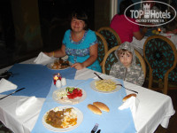 Питание в отеле разнообразное. На завтрак готовят яичницу с наполнителями, омлет, яйца варёные, фруктовый салат, есть сметана, джемы, что-то типа блинов, сухие завтраки, разнообразная выпечка, огурцы, помидоры, капуста, салат, масло в упаковочках, чай, кофе в пакетиках, молоко, напитки типа Юпи, можно поджарить тосты, . На обед и ужин супчики, мясо в виде гуляша, люля-кебаб, котлеты гриль, курица гриль, рыба каждый день, но одна и та же. На гарнир картофель печёный, фри, рис, варёные овощи (капуста цветная, брокколи, морковь), макароны в виде пасты с соусом и наполнителями. На десерт торты суфле, торты бисквитные, кексы, пирожные, пудинг. Овощи свежие нарезанные: помидоры, огурцы, салат, капуста. Напитки разносят официанты (кола, вино, пиво). 2 вида фруктов: нарезанные апельсины, финики, бананы, гуава или мандарины. На обед и ужин необходимо приходить либо к началу, либо через час. Столиков не хватает. Официанты стараются, менеджер отеля сам им помогает убирать посуду, чтобы быстрее освободить столик и посадить отдыхающих. С 15 ч. 30 мин. до 17 ч. в бареу бассейна можно взять мороженое. Наш малыш ждал каждый день когда принесут мороженку.