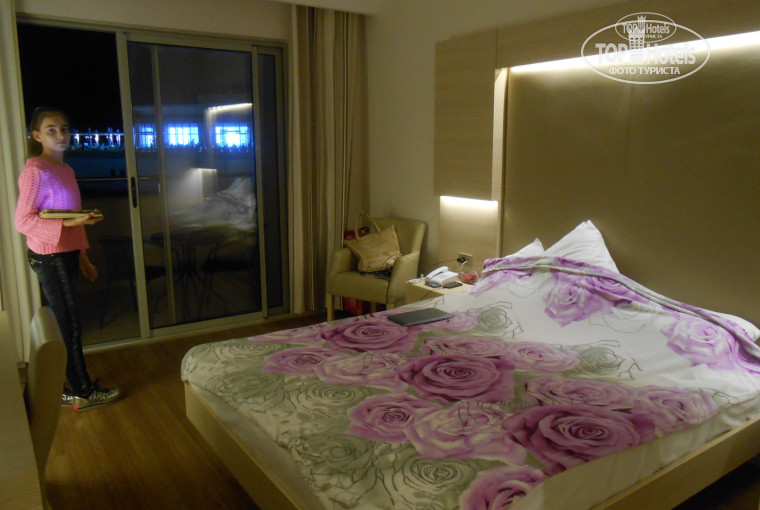 Номер (1406) дали на "0" этаже, т.е. на том же, где находится ресепшн, лобби бар с вай-фаем, главный ресторан. Номер «свежий», после ремонта, небольшой, для нас двоих с дочкой (12 лет) в самый раз. В комнате: двуспальная кровать с подвесными прикроватными тумбочками в одну полку-ящичек; кресло и стул из кож/зам; небольшая плазма (2 канала: ОРТ и Вести Москва 24) на письменном столике с узким ящичком для письменных принадлежностей (у нас там легко уместились лекарства); мини-бар с двумя бутылками воды (пополняется каждый день), колой и фантой; зеркало над столиком; картина для интерьера; зеркало в рост; шкаф-купе с полкой, платяным отделением с неснимающимися вешалками (по моему штук 8 было); внизу сейф (без инструкции, в следствие чего у нас возникли проблемы с началом его использования, поэтому лучше сразу попросите на ресепшене помочь с кодированием замка) и полочки для обуви с одноразовыми тапочками. Полотенца меняют каждый день, несмотря на то, что мы их даже не пол не бросали, как нас «научили» в других отелях. Ежедневно пополняют запасы мыла, геля для душа, шампуня и туалетной бумаги. Есть мощный фен (свой даже не пригодился), два стеклянных стакана в ванной. На балконе два стульчика со столиком, пепельница и небольшая сушилка. Также в номере обязательно будет памятка для туриста на 4 языках и телефон. Освещение в номере очень слабое, сумрачное. Кондиционер работает только при закрытом на замок балконе и строго до наступления ночи, потом самостоятельно отключается, потом его можно включить только утром, находится над проходом в комнату, без пульта д/у. Электричество выключается через несколько секунд после того, как вы вынимаете карту-ключ. В номере есть управление дверным звонком, где вы можете нажать "не беспокоить" (и тогда даже звонок в номер работать не будет) и "уборка номера" (взамен картонных информационных карточек, которые вешались с внешней стороны двери) и снаружи будет гореть соответствующий рисунок с цветной подсветкой. Больше ничего в номере нет. Уборка номера проводится каждый день, если только вы не захотите сами, чтоб вам не мешали, для этого есть кнопочка, о которой я писала ранее.