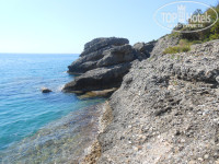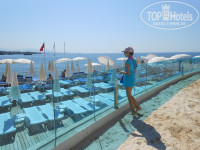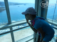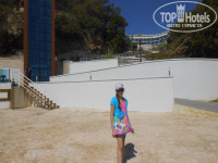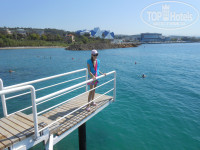 После обеда мы пошли обследовать территорию при свете дня. Спустились на искусственный пляж на обзорном лифте. Необычные ощущения. На первой платформе (-1 этаж), на которую вы сразу попадаете из лифта, находится бар (единственный бар, где бармен полный отстой), столики, туалетные комнаты. На второй (-2 этаж) чистый песок, столик менеджера по водным видам спорта, душевые и раздевалка. На третьей платформе (-3 этаж) на деревянном полу лежаки и лестницы в средиземное море, а также мостик для прыжков. Там же находится «центр водных видов спорта», где вы можете заказать себе услуги: катание на катамаране, водном мотоцикле, банане (10$ с чел.), диване (20$ с чел.), таблетке, парашюте (с нас двоих взяли 70$) и прочее. В процессе катания вас фотографируют, потом продают фото: 1 фото – 6$ все фото «оптом» по 1$ за шт. Вода чистая, теплая. За счет того, что входа с земли в воду нет, она не мутная, в отличие от «дикого пляжа», куда еще и заплывают катера.