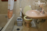 Заходишь в номер и сразу чувствуется запах сырости или какой-то затхлости. Может это недостаток первых этажей? Номер небольшой, стены покрашены краской, немного обшарпанные, есть косметический столик с зеркалом, маленький старый ТВ (у нас не оказалось пульта), холодильник (холодил так себе), два кресла и между ними еще столик. Балкон с пластиковыми столом и двумя креслами. Веревок для сушки белья не было, сушили на стульях и крепили в стульям привезенными прищепками из-за сильного ветра.