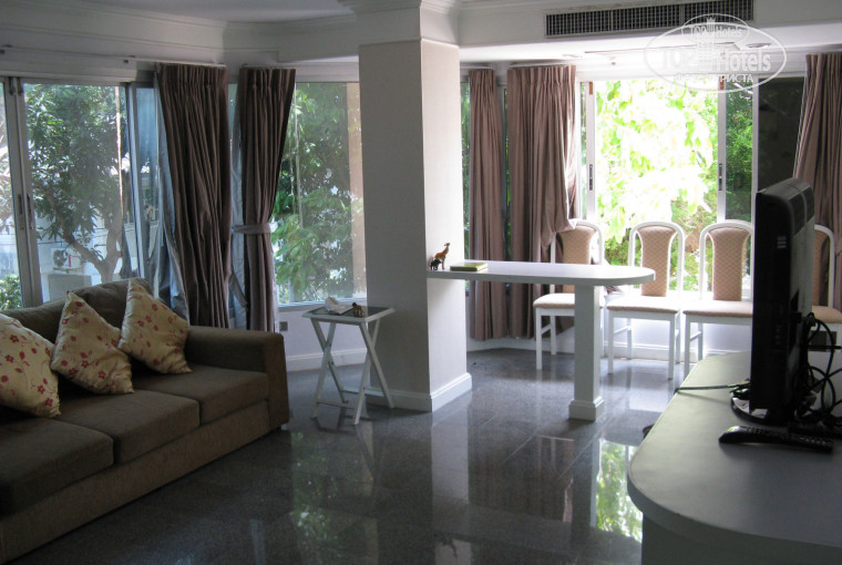 Номер Suit Garden View. Номер на втором этаже 201, балкона нет. Впрочем, и вида на сад так же нет. Есть просто вид из окна и этого было достаточно. Номер большой: 2 спальных комнаты, гостиная, 1 санузел. Спальные с большими кроватями, в одной из спален LCD телевизор и порядка 6-7 каналов на русском языке с неплохой подборкой фильмов. Гостиная большая с кухонной зоной: диван, телевизор, стол и стулья, холодильник, чайник, фен, прохладный мраморный пол. Кондиционеры индивидуальные несколько шумно работают за окном от перегрева. Стены и мебель белого цвета, чистое и аккуратное все, но явно пожившее. Уборка ежедневно. Смена белья ежедневно. Чаевые в 10-15 бат удовлетворяли уборщиц) Постельное белье и полотенца исключительно белого цвета, от старости с серым налетом и периодически с дырочками. Отель комфортный, удобный, лет 30 назад он был прекрасен, сейчас ощущение ветхости присутствует. Однако! Ничего не разваливается, не скрипит и не раздражает. Мы выбором отеля остались довольны. Читала отзывы перед поездкой, в большинстве случаев они соответствуют.
