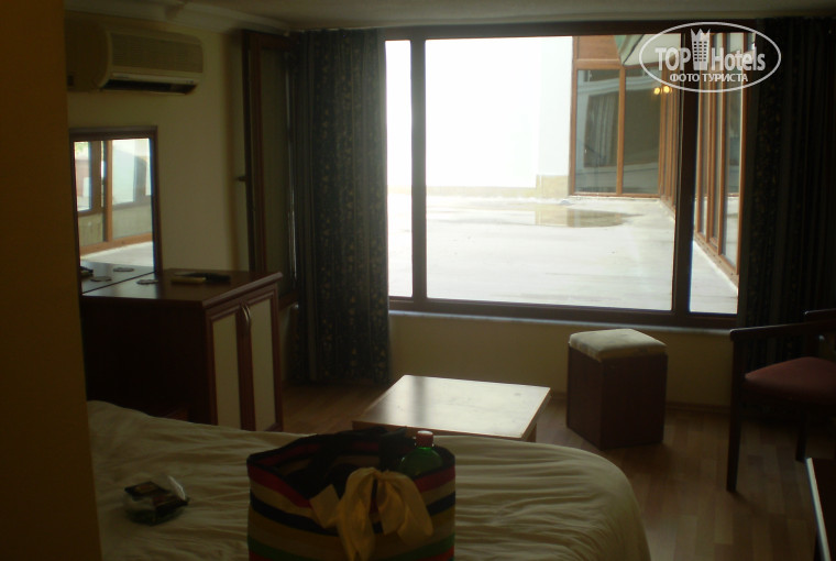 Особое внимание стоит уделить внутреннему обустройству отеля. Вполне приличный просторный холл с кожаными креслами и небольшими скульптурами, в уголке - небольшой водопадик, который подсвечивается по вечерами и радует редких посетителей журчанием воды. Особо порадовало наличие вай-фая. Тут же помещение внутреннего ресторана, где накрывают в дождливую погоду. Номерной фонд невелик. Номера после ремонта - чисто побеленные и местами даже покрашенные. Вам повезёт, если вас разместят выше первого этажа (есть работающие лифты). Балконы в 5% угловых номеров. Остальные - просто двери и загородочки из стекла. У меня балкона не было. Вообще никакого вида на море не было. С расселением мне не повезло. Я ездила одна, а одноместные номера, как мне объяснили, у них только на 1 этаже. Поселили в номер 3104 для лилипутов. Высота полтолка - 1м 75 см. Пол - ниже уровня внутреннего дворика. Полуподвал короче. Окна - на стену противоположного корпуса и на застеклённый переход, где постоянно ходят люди. Так что особо открывать окна не имелось возможности. Напротив номера - служебный лифт уборки - днём поспать невозможно, п.ч. болтливые турецкие женщины вечно обсуждали там свои проблемы, стоя среди куч грязного белья, собранного со всех этажей 3 корпуса. В номере постоянный затхлый запах. Из кондиционера по включении - тот же запах. На ночь открывала окна на свой страх и риск, т.к. любой может зайти в гости с улицы, перебравшись из перехода через открытые там окошки. Комары были, но особо не донимали, учитывая наличие предусмотрительно захваченного из дома раптора. Пыталась поменять номер - отказали. "Отель - фул", типа полный, некуда переселять. Жалоба гиду не помогла . Потом ещё два дня ходила, обращаясь на ресепшн всё с той же просьбой и слышала, как люди подходили - жаловались, что не работает кондик, сломан душ, прорвал унитаз и всякое такое... У меня работало всё, кроме фена, но я им не пользовалась. Подумала и решила не искать себе новых неприятностей.