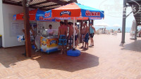 На пляже снэк-бар. Мы там обедали всё время. Отличный фастфуд. Гамбургеры, хот-доги, пицца, картошка фри, супчик, спагетти, вобщем много всего. Опять же напитки там какие хочешь.